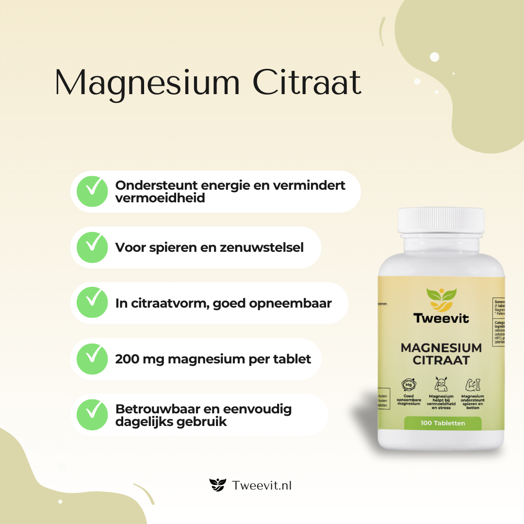 Magnesiumcitraat is een goed opneembende vorm van magnesium, die helpt bij het aanvullen van de dagelijkse magnesiumbehoefte.